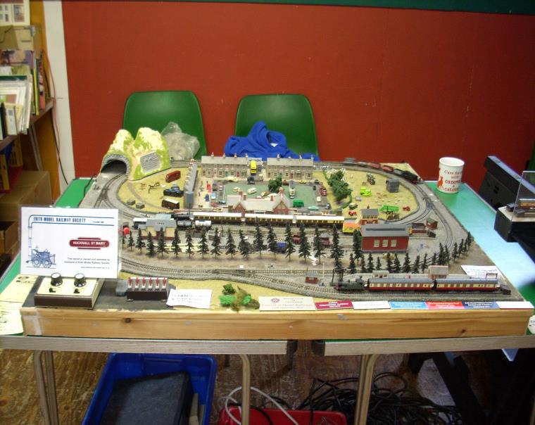 This small English town layout was donated to the Bone household in 2010. It depicts 2 circles of track typical of a small country town scene with a branch line halt. An avenue of trees, boulevard style, separates the two station areas. It comprises of engine shed, goods and coal yard, sidings, tunnel, signal box, water tower and level crossing. The town consists of terraced house around a square green with a round way to the motorway system. Vehicles of all descriptions abound including a station car park. A footpath leads from the station to the neighbouring hills with farm animals roaming.
