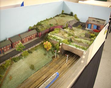 The layout comprises of a four track main line in a cutting passing a signal box between two tunnel entrances. From the layout's point of view, the name Adams Row comes from the area, which can be any rural location in England, where the housing and amenities were built for the workers of the Adams Brothers' Explosives factory, which is on the right of the set-up. It is now in a run-down state, but the housing is still there.
