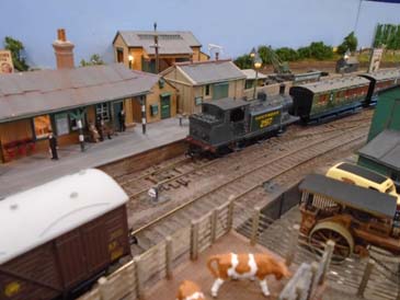 There is a small engine shed with coaling and water facilities. There is also a grounded coach body which serves as a mess-room. The station lighting fully works using Gaugemaster gas lights which look really nice when lit. Most of the buildings are scratch-built, the station being a particular favourite. The cattle-dock had to be adapted to fit in the available space. Although being a simple track plan many train movements can be done. The signals are from Dapol which are lit and fully working. They are each fed from a single 9 volt transistor battery.