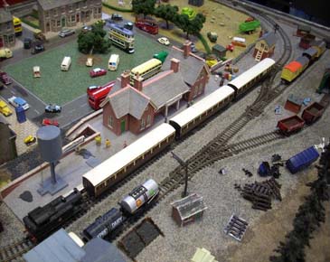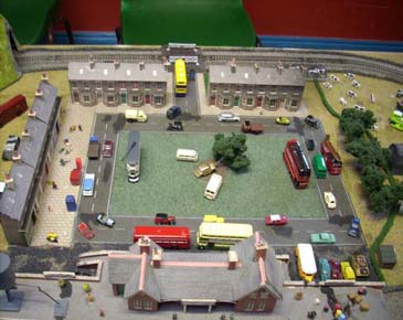 This small English town layout was donated to the Bone household in 2010. It depicts 2 circles of track typical of a small country town scene with a branch line halt. An avenue of trees, boulevard style, separates the two station areas. It comprises of engine shed, goods and coal yard, sidings, tunnel, signal box, water tower and level crossing. The town consists of terraced house around a square green with a round way to the motorway system. Vehicles of all descriptions abound including a station car park. A footpath leads from the station to the neighbouring hills with farm animals roaming.